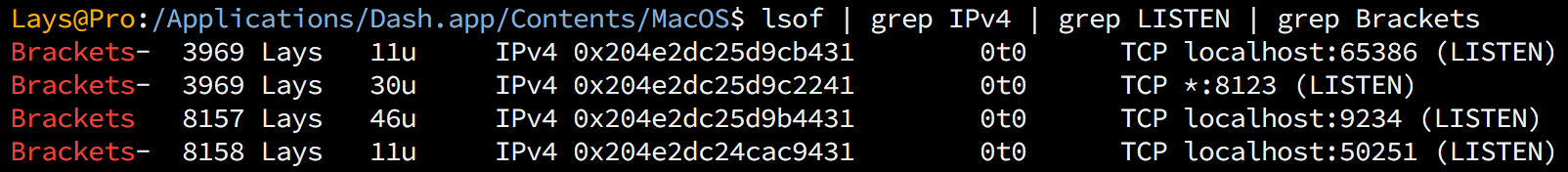 Brackets- 3969 Lays 11u IPv4 0x204e2dc25d9cb431 0t0 TCP localhost:65386 (LISTEN)